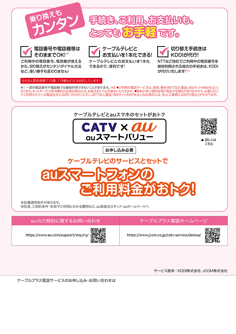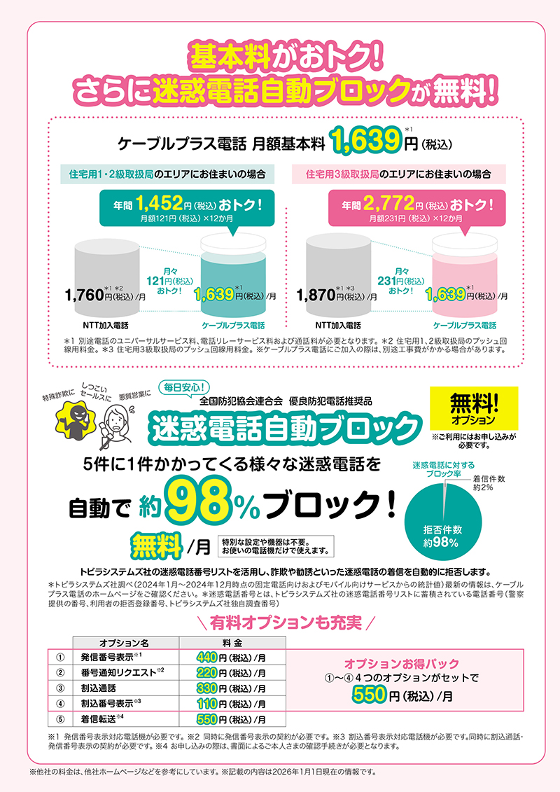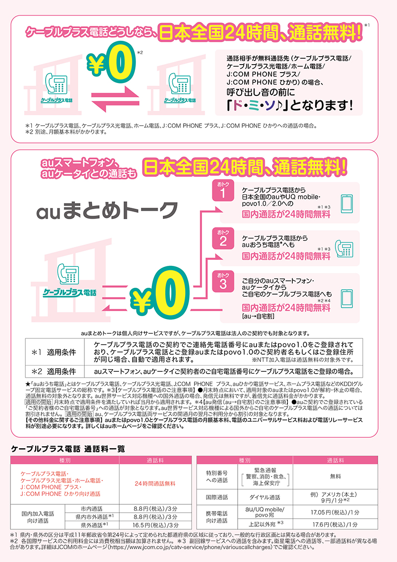 一部集合住宅等において、ケーブルプラス電話の導入ができない場合があります。